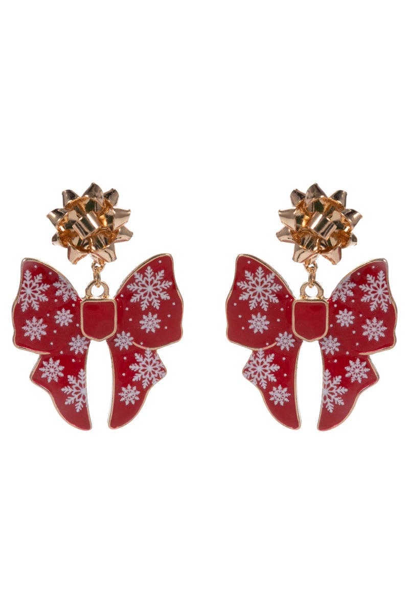 Featuring a charming gold bow stud, complemented by a vibrant red and white bow, these dangle earrings are the perfect blend of elegance and playfulness.
