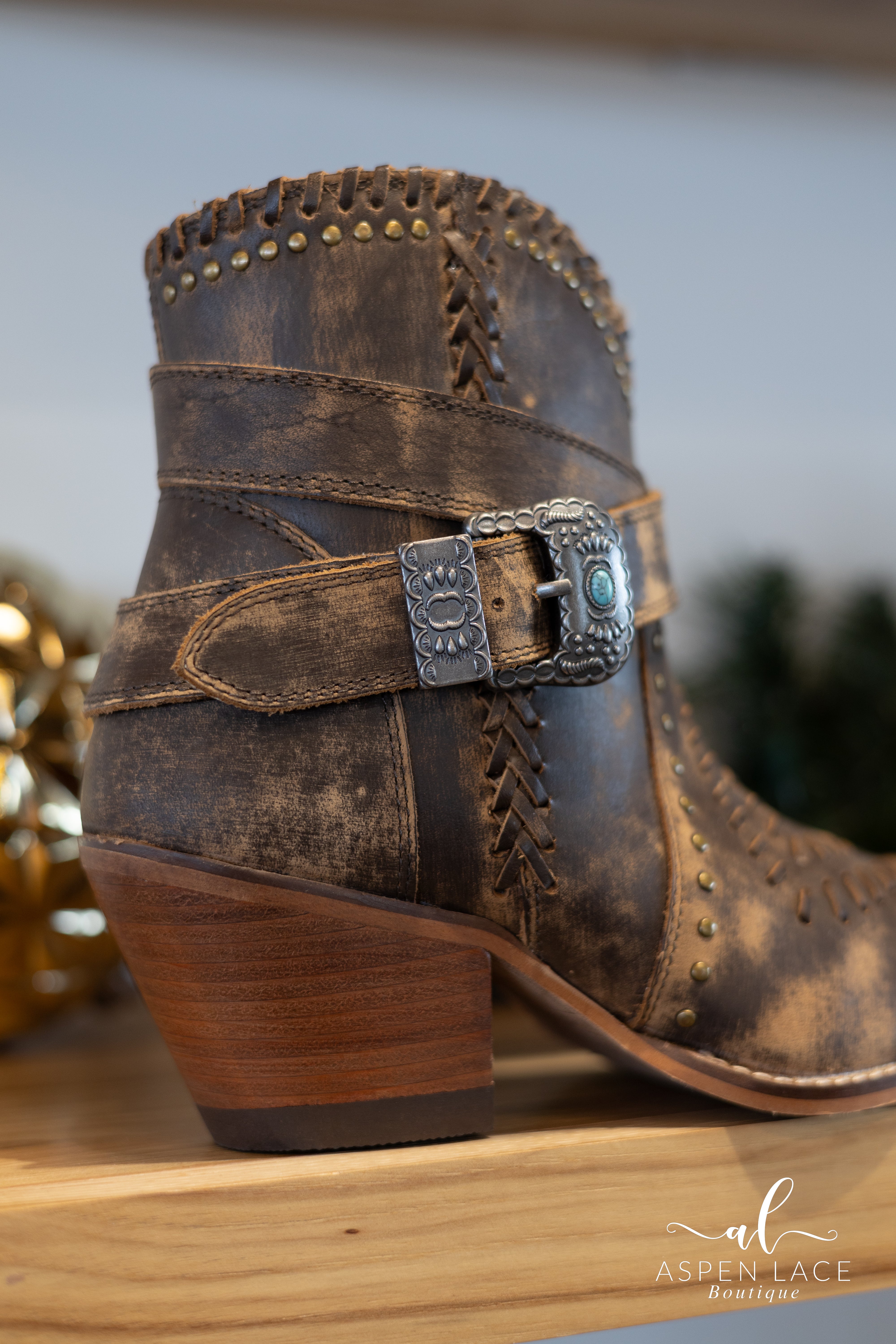 Made for the trail and styled for the town, these dusty tan Western booties for women are a true classic. They feature genuine leather, detailed handweaving, and a soft foam insole for comfort all day. A sturdy handmade rubber sole and supportive high heel add durability, while the snip toe keeps the look sharp. A bold belt and concho detail give it that unmistakable Western spirit. Designed with care and artisanal precision, these leather booties are built for everything from rodeos to weekend drives.