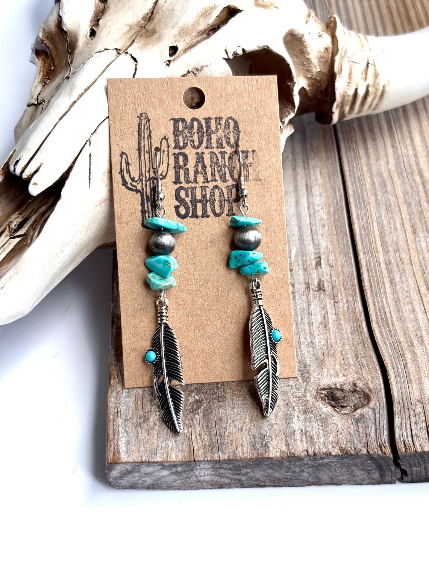Western Metal Feather w/ Stone & Navajo Pearl Bead Dangle Drop Earrings Size: 3.25" Fishhook Back Brushed Silver, Navajo Pearl Bead Lead Compliant