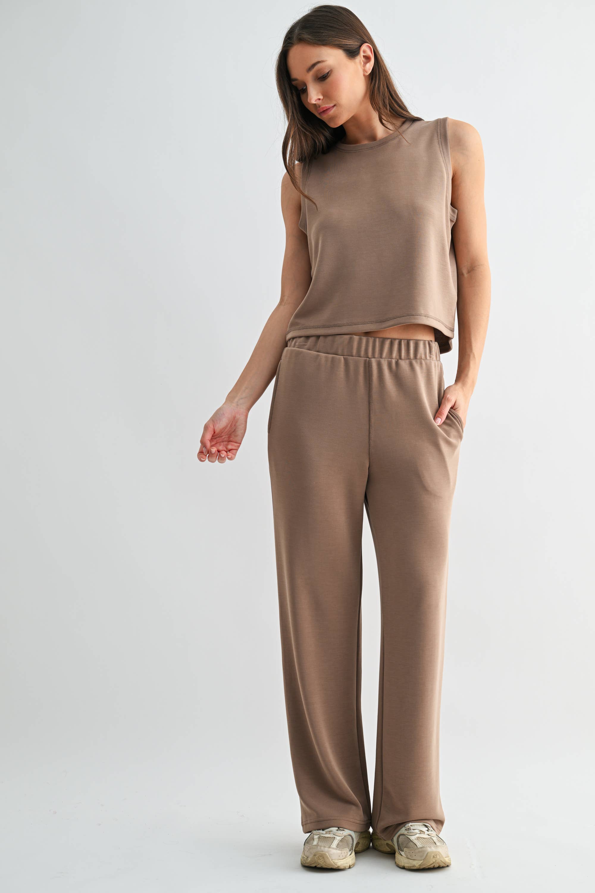 Slip into sleek comfort with the Laguna Set—your go-to for elevated lounging or laid-back days. Made from our buttery-soft, lightweight scuba fabric, the tank features a subtle high-low design and curved hem for a flattering, effortless drape. Paired with 27" inseam pants complete with side pockets, this set offers easy movement and everyday polish with a touch of coastal ease. Liza is 5'9.5", a size 2, and is wearing an S. Material: 47% modal 47% polyester 6% spandex. Machine wash delicate. Dry flat.
