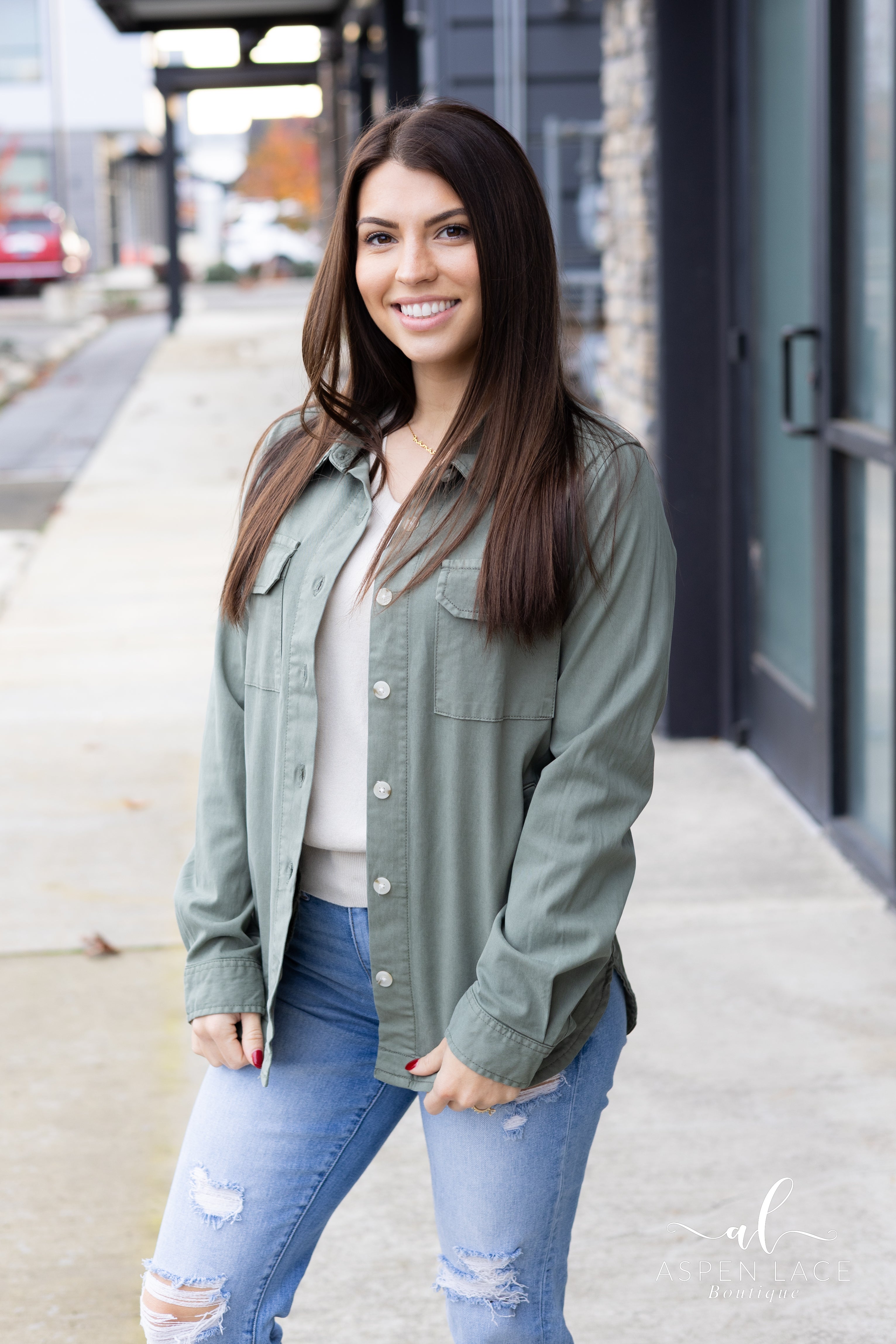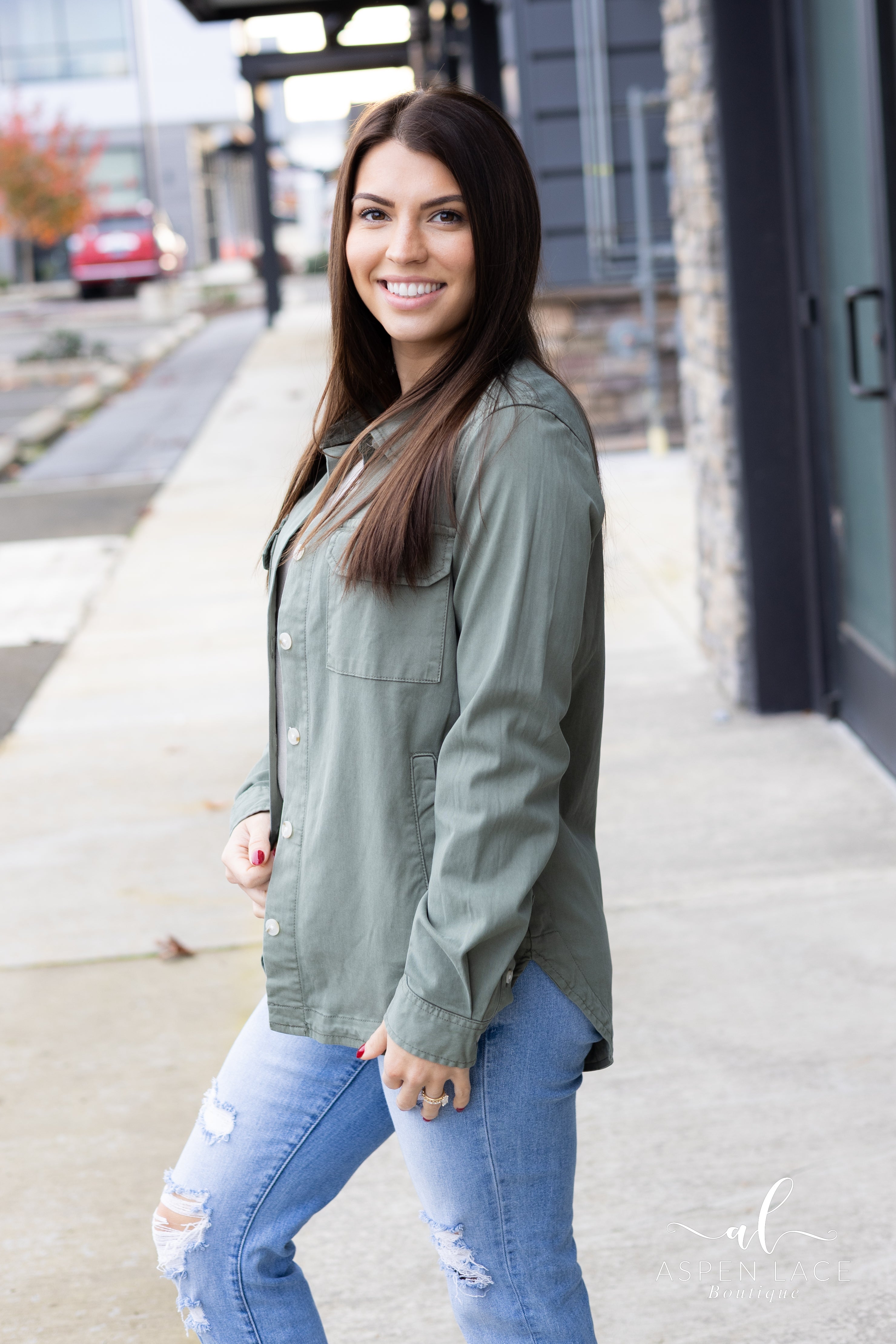 Upgrade your shacket collection with the classically cool jacket featuring button front closure, shirt tail hem, patch pockets and dual side pockets.
