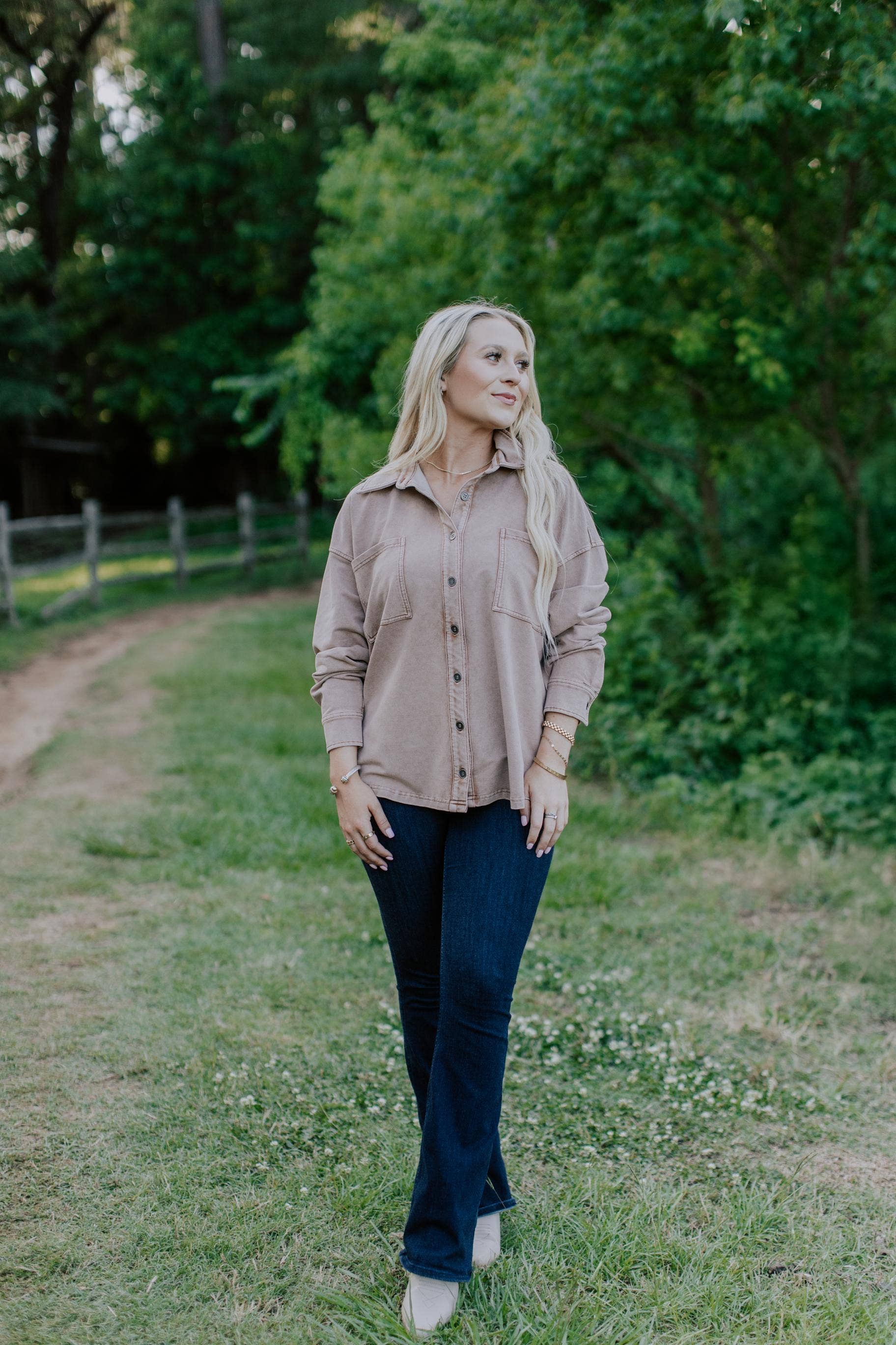 This acid washed shacket brings a broken-in look with modern ease. Designed with dual chest pockets, button front, and relaxed structure, it layers effortlessly through changing seasons. The acid wash finish softens the color into a versatile neutral with a subtle mauve undertone, making each piece unique.