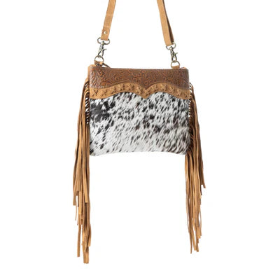 Crafted for the cowgirl with bold taste, the Myra Timber Trail Hairon Bag in Burnished Bronze & Soft Porcelain blends rugged elegance with show-stopping detail. This standout piece from our hair on hide handbags collection features luxe western leather embossed with rich tooling, complemented by a naturally spotted hairon body. The layered fringe sways with every step, while its compact shape keeps it light yet functional. For lovers of authentic craftsmanship, this is one of the most striking Western leather handbags to elevate your ensemble.