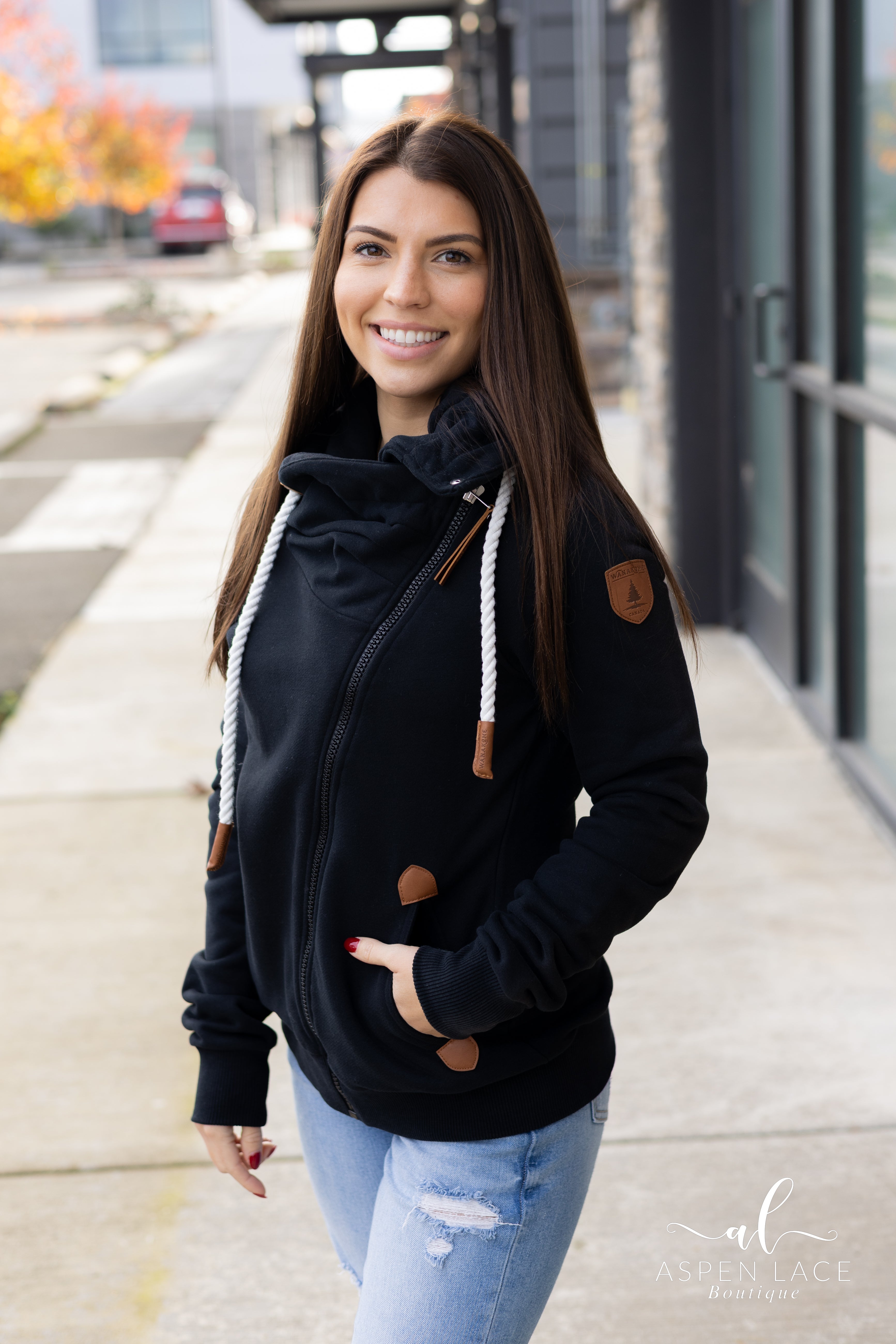 - Cowl neck with adjustable rope drawstrings and vegan leather caps