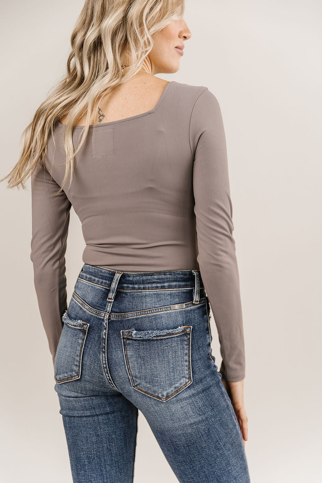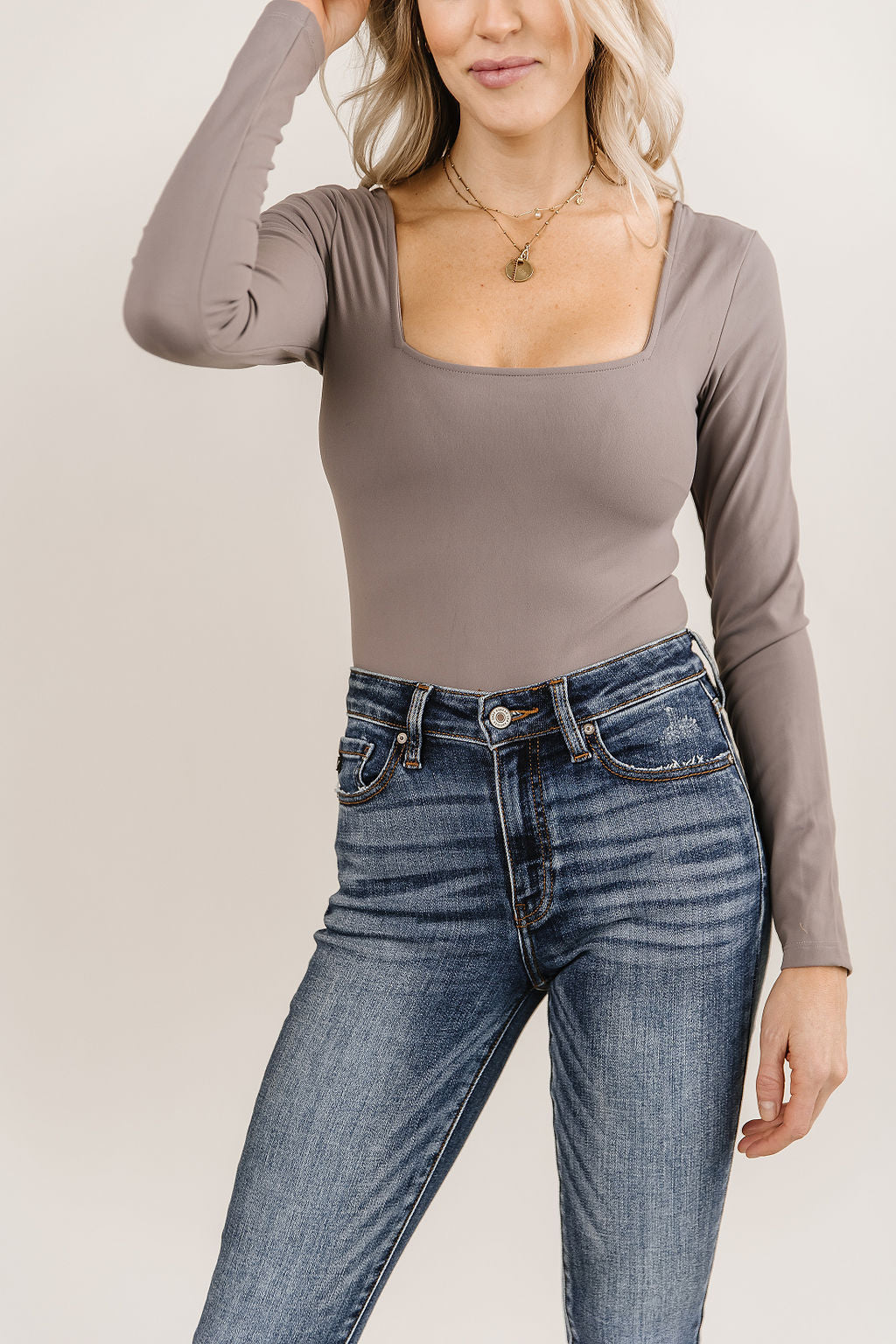 Black long sleeve square neck bodysuit, classic snap closure with 2 length options for customized fit.