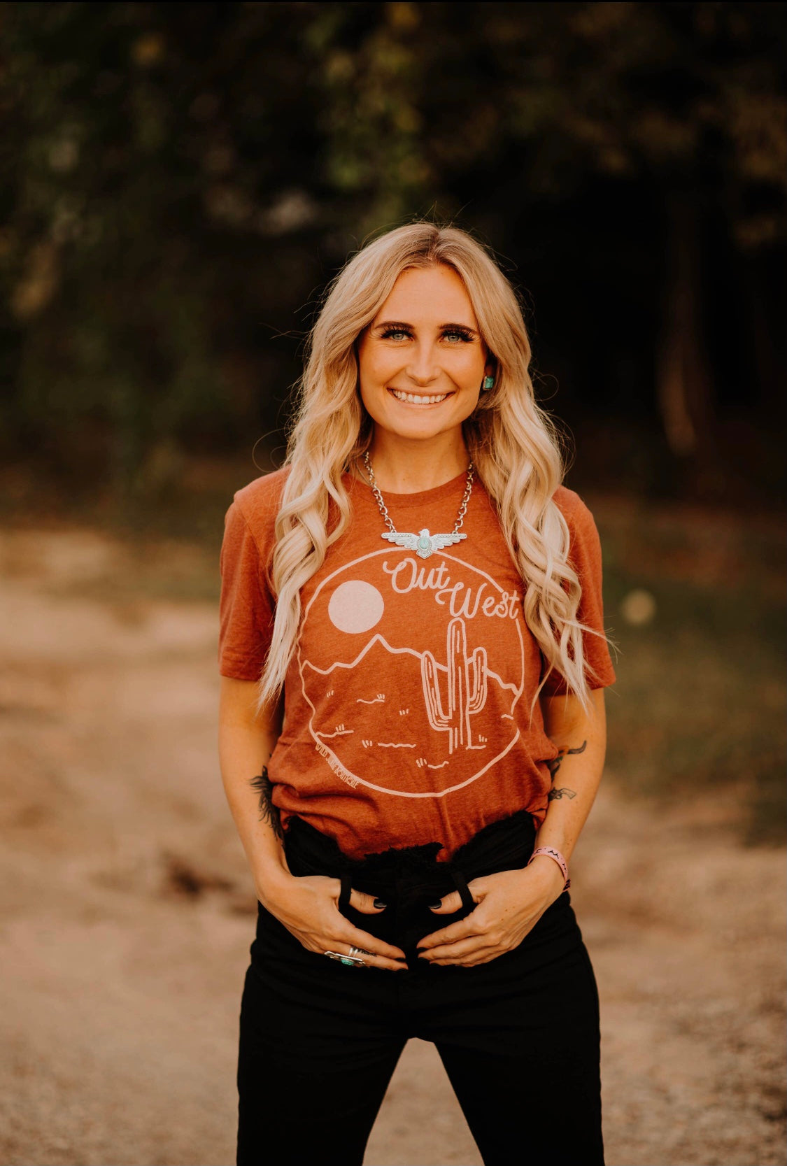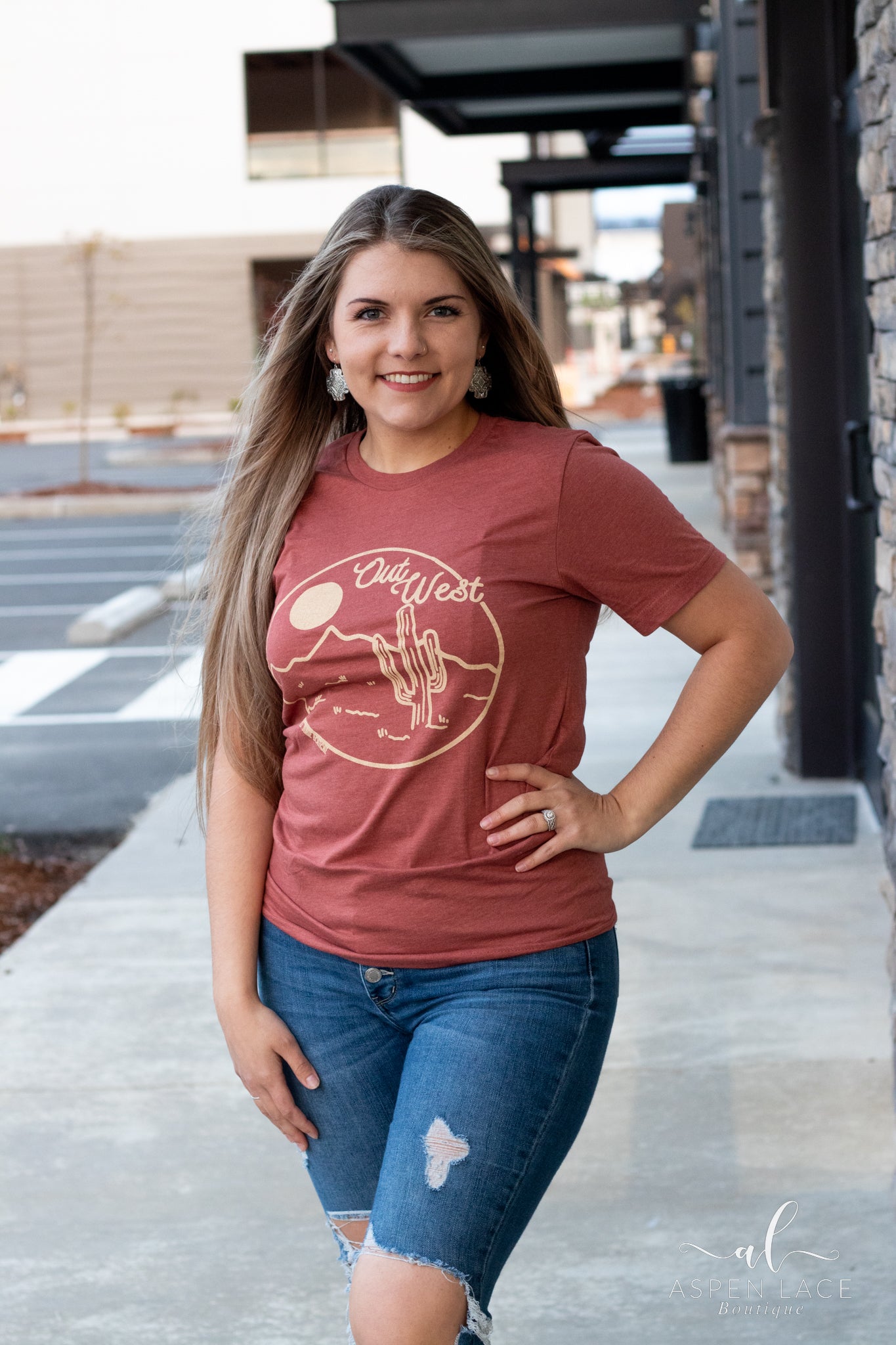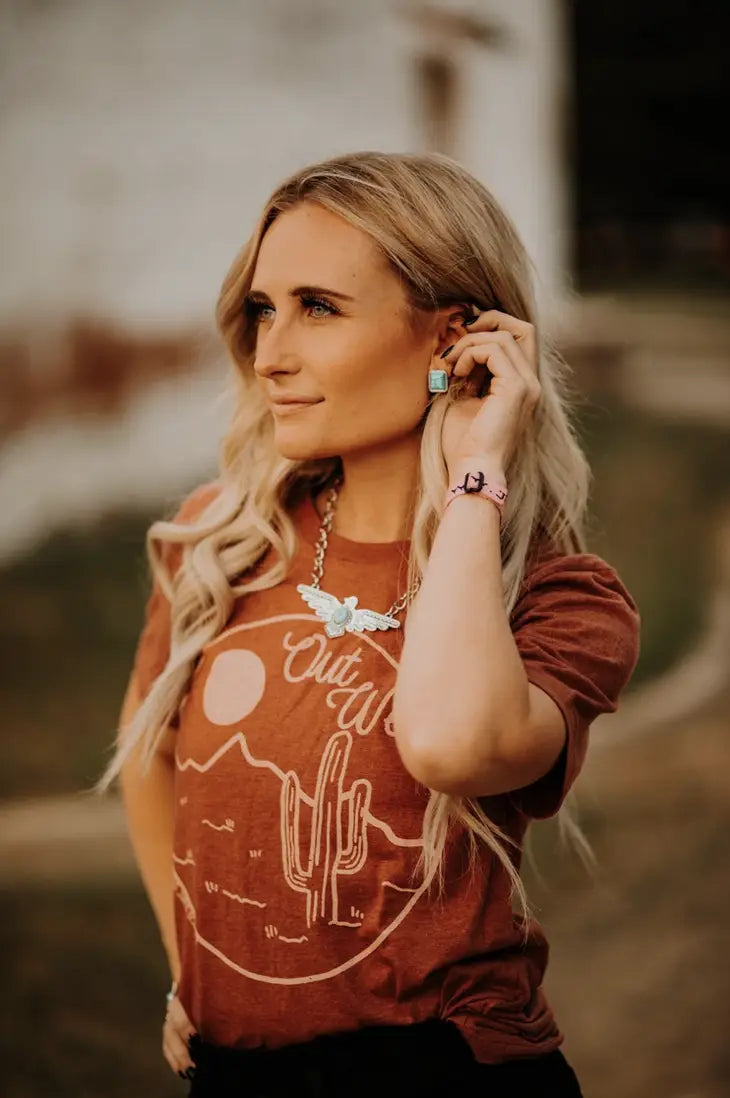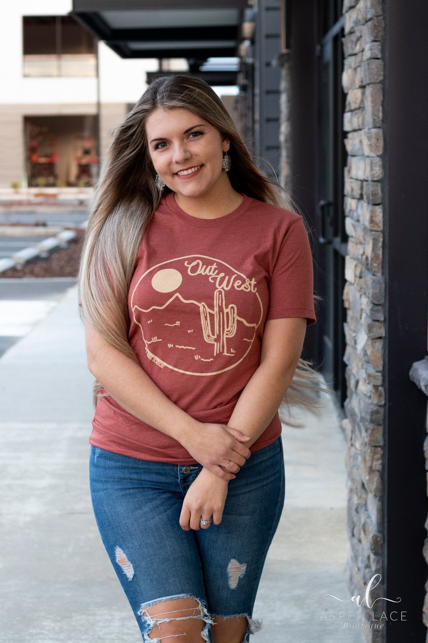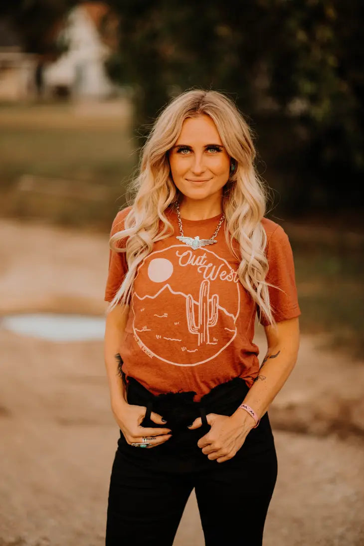 Get a classic western style with the Out West Tshirt in Rust! Featuring a beautiful cactus sunset design to give you an extra dose of desert vibes. Relaxed fit and true to size for everyday comfort.