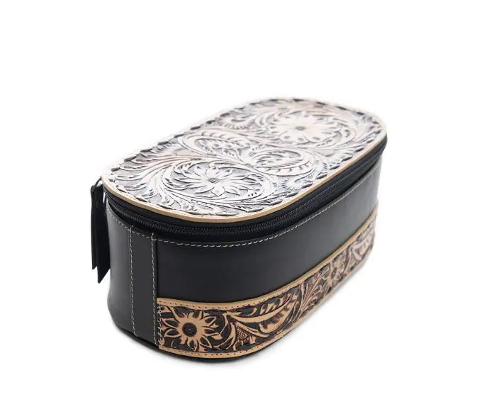 Sophistication and irresistible style describe this toiletries bag! It offers fine hand-tooled leather in the company of beautiful ebony leather. You’ll have plenty of room to store your items, including in the zippered pocket on the inside lid. Wrap-around zippered closure assures everything stays secure. You'll love it as a stylish and practical addition to your collection!