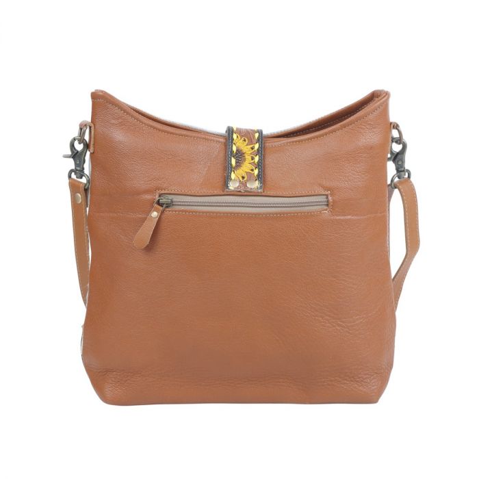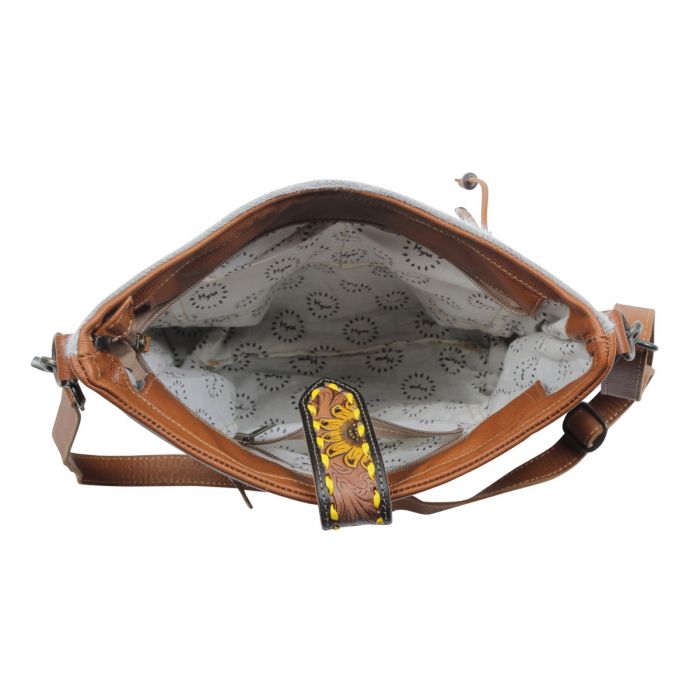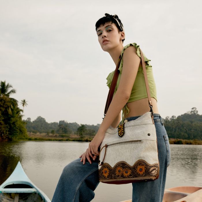 A uniquely minimal approach to designing and patterns - this hand-tooled bag boasts of serene looking light base colour with an equally vibrant touch of flowers at its bottom!